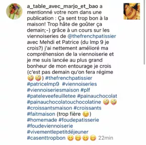 "C'était ma première masterclass (...) J'ai adoré (...) J'ai eu l'impression de pâtisser avec vous (...) Ca m'a conforté dans ce que je faisais."