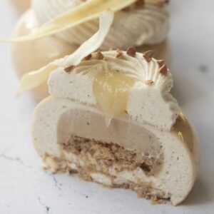 Mots clés: automne, Bretagne, café, crémeux intense, ganache montée empesée, glaçage miroir, panais, praliné sarrasin, sarrasin