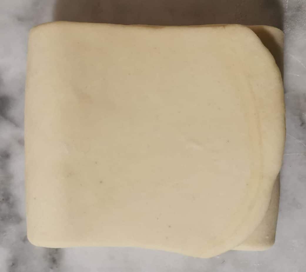 Pliez le pâton de feuilletage en suivant le procédé détaillé dans les photos ci-dessous. Assurez-vous  bien que la jonction entre les deux parties pliées est totale, et que toutes les couches se superposent parfaitement. Votre feuilletage va ressembler à un genre de portefeuille.