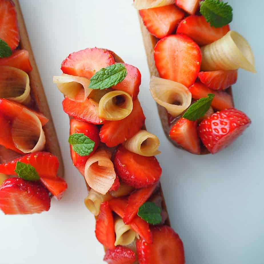 L’association fraise et rhubarbe, c’est vraiment le combo magique des fruits de la belle saison. Dans cette tartelette, nous avons voulu les associer de manière équilibrée afin qu’aucun de ces deux fruits ne prenne le dessus sur l’autre. La gourmandise de la fraise cueillie à point contrebalance subtilement le goût acidulé de la rhubarbe. Ajoutez à ça un jeu de textures alliant fondant, croquant et croustillant et cette tarte fera des merveilles sur vos tables printanières et estivales.